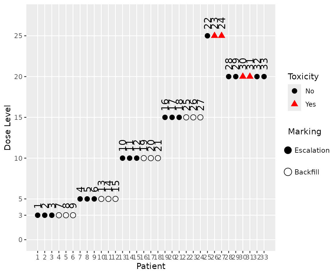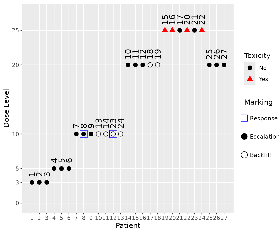 We can see from the patient IDs, which are assigned sequentially in time, when the backfill patients were recruited (those with an empty shape). For example, we see that the highest dose which was backfilled is 15, after which the maximum of 12 backfill patients was reached.